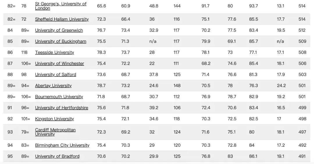 乍一看,完全没找到其他大学排行榜上任何科研成果,学术论文发布数量,硬件软件设施投资等评分标准...没错,和其他主流大学排名QS、泰晤士主要走科研水平排名路线不同,《卫报》的评分标准几乎都围绕着学生本身,主要是成绩和满意度——学生给所上的课程打多少分?是否定期收到教授的反馈?疫情和通胀下毕业后找得着工作吗?诸如此类。也正是因此,《卫报》的英文不是Ranking,而是说University League Tables。