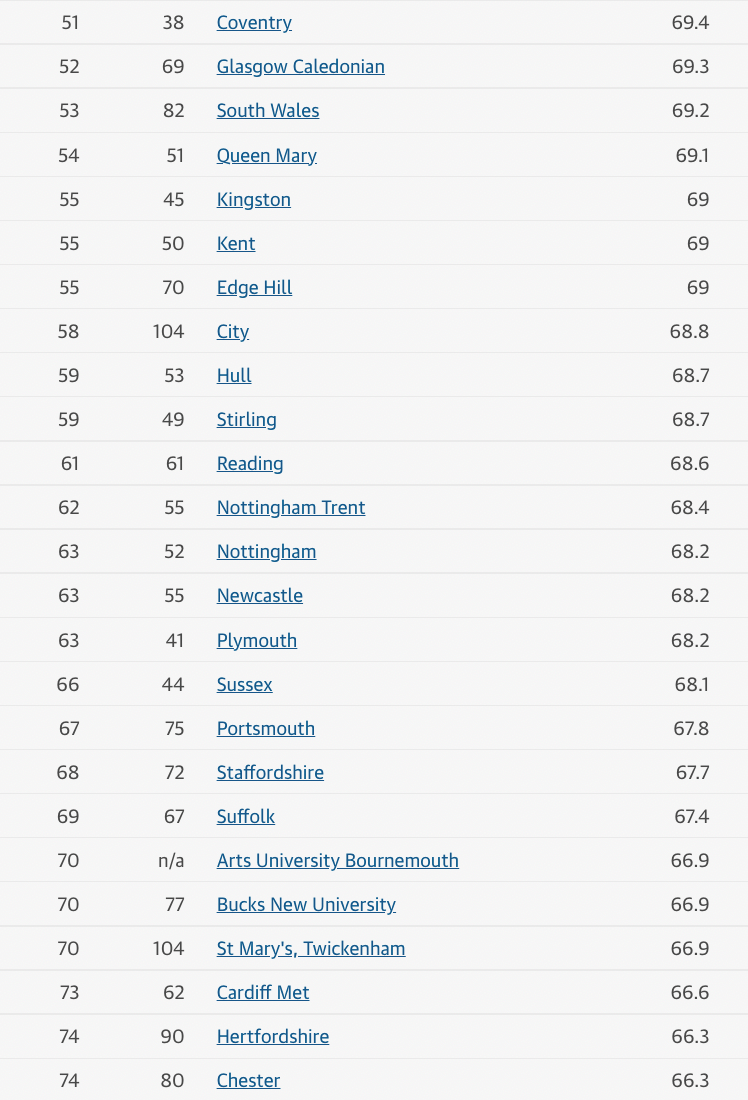 其实卫报排名本来就是设计给本科生看的。排名中有三个指标基于NSS结果,而NSS仅面向本科生进行。录取成绩指标则是基于A-level成绩进行的。卫报排名高的大学,普遍校园生活丰富,在英国本土认可度较高,更适合打算长时间留在英国学习工作的同学参考。