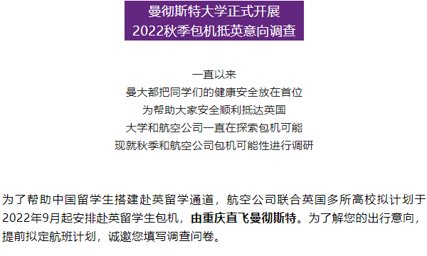 曼彻斯特大学、杜伦大学等高校均已发布【2022年秋季包机抵英意向调查】相关通知,有意参与的同学们注意啦!